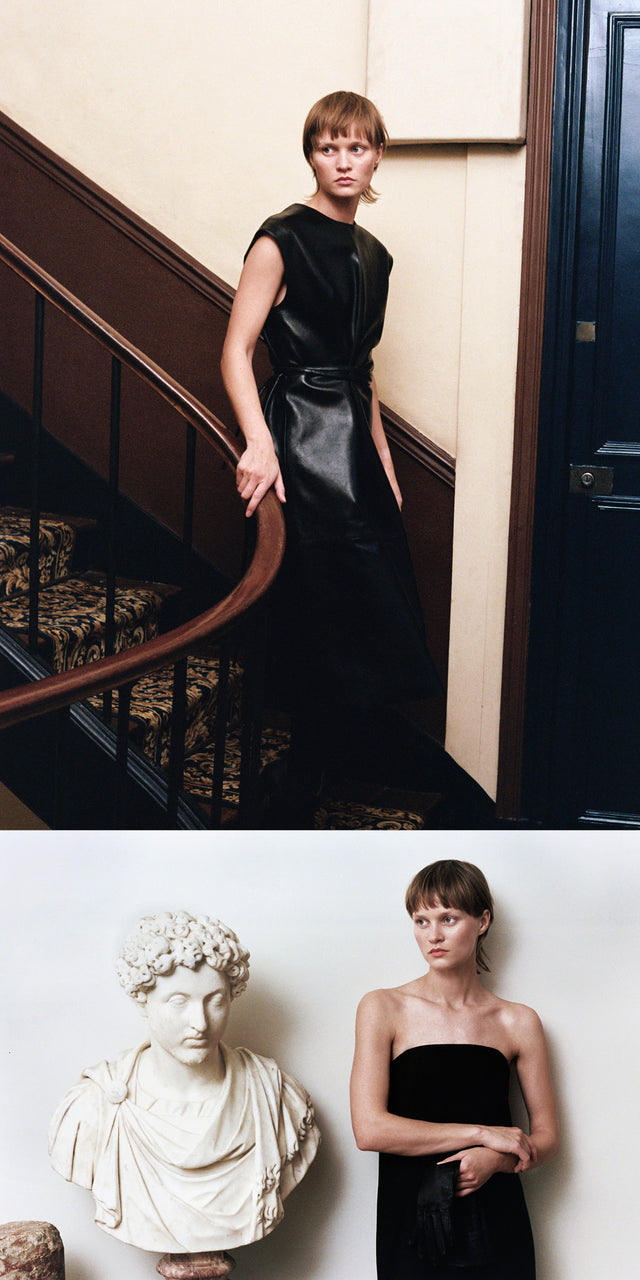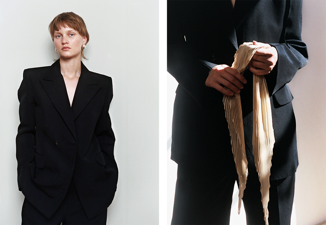 Un traje oversize tomado del armario masculino se combina con un vestido bustier de lana de líneas depuradas. La piel de lana abriga el cuerpo, los cueros brillan en un verde oliva intenso o en negro lacado. El punto fino se desliza suavemente sobre la piel. Los zapatos de tacón Théa en color marfil, el bolso Suzanna en charol y el pañuelo de seda plisado completan este look sofisticado y sobrio.