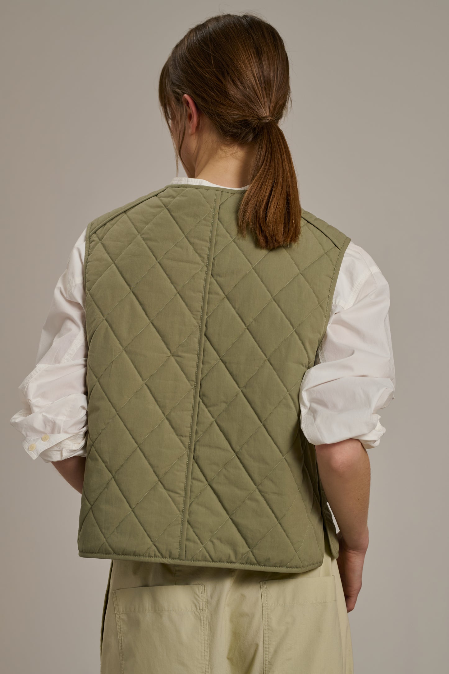ULLA es un chaleco acolchado de algodón que puedes combinar como quieras. Tiene un ligero relleno, pero es lo suficientemente delgado como para llevarlo debajo de un abrigo sin restringir el movimiento. Los acabados con ribete destacan los hombros, los bolsillos de parche, y la tira de botones.