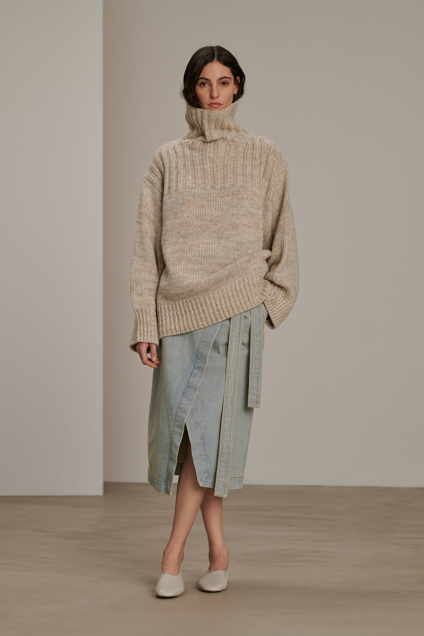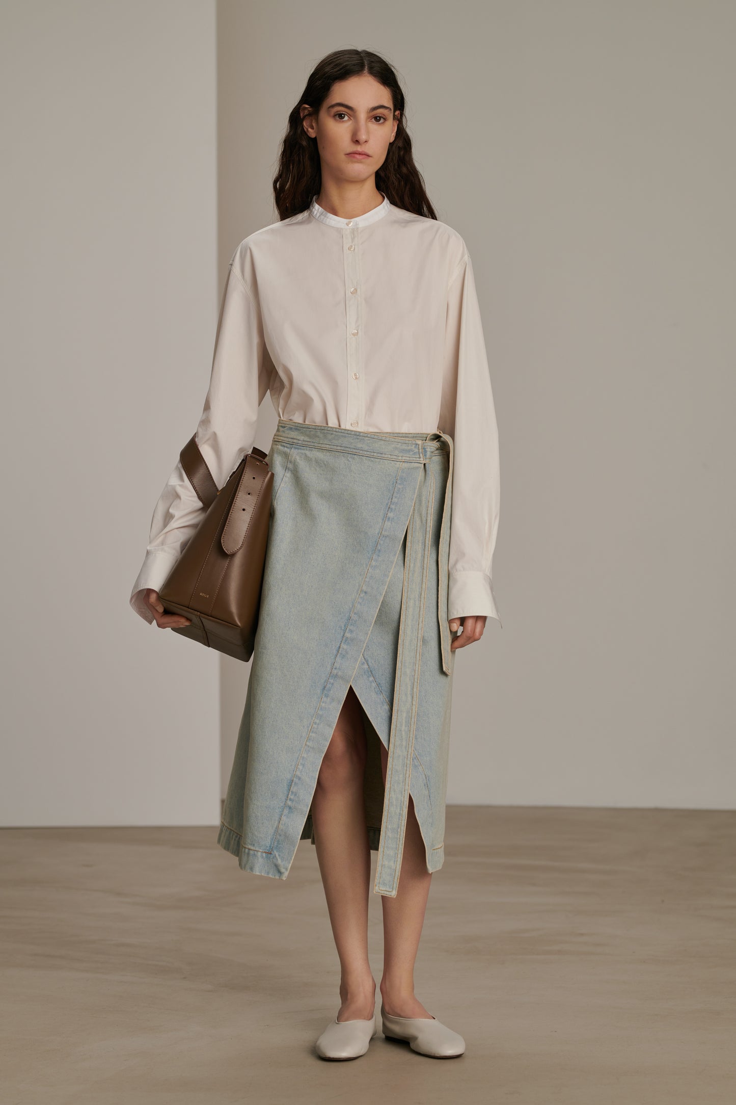 BLONDIE es una falda vaquera cruzada. Su corte elegante a media pierna realza la silueta al tiempo que ofrece una cómoda libertad de movimiento.