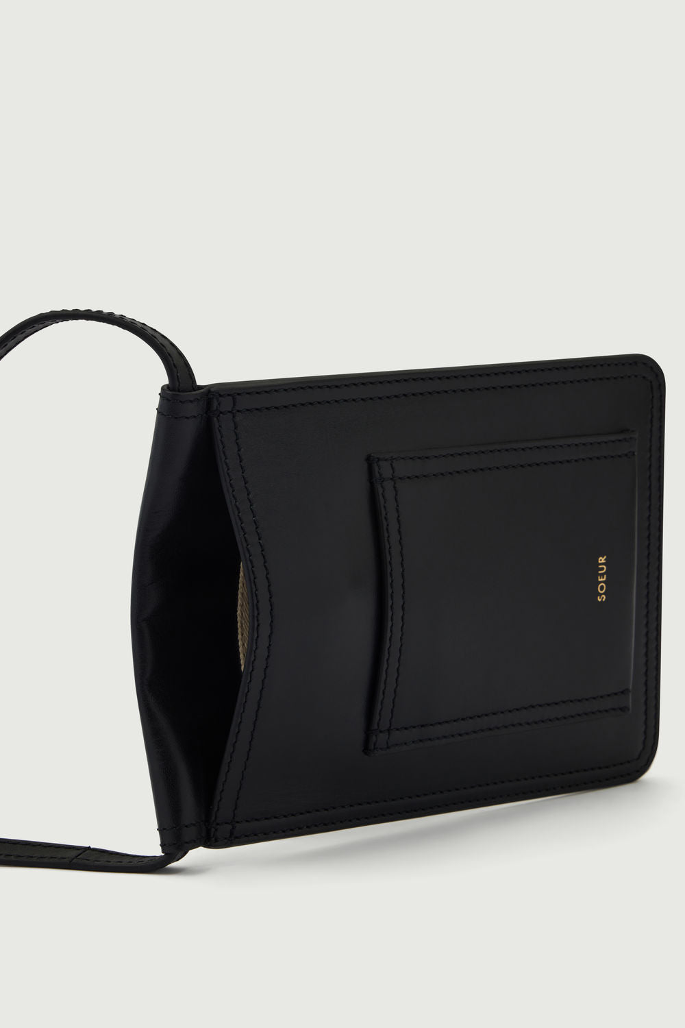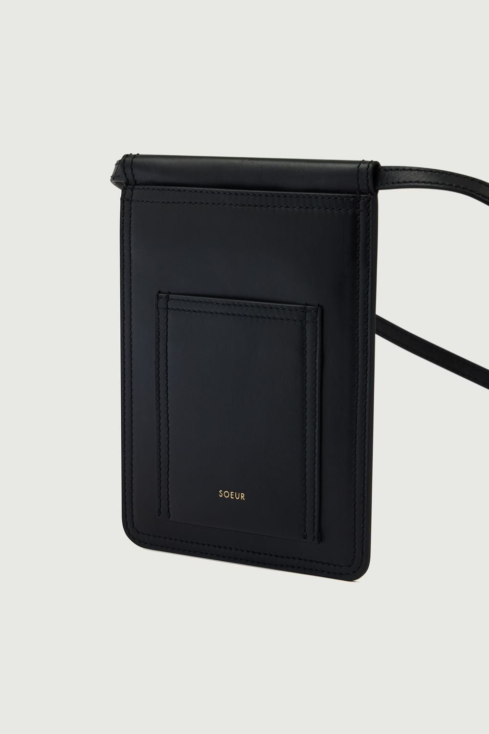 Pochetera plana de cuero liso con bandolera negro