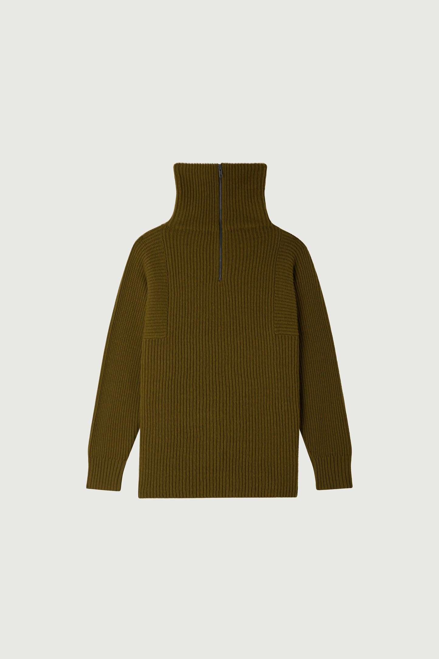 VISBY es un jersey con cuello de camionero inspirado en el armario masculino, confeccionado en lana merino. Presenta un cuello alto con cremallera, para llevar abierto o levantado, así como un diseño de punto acanalado que aporta relieve a su color verde caqui. Su corte es intencionalmente oversize, y dos aberturas laterales le añaden un toque especial al modelo.